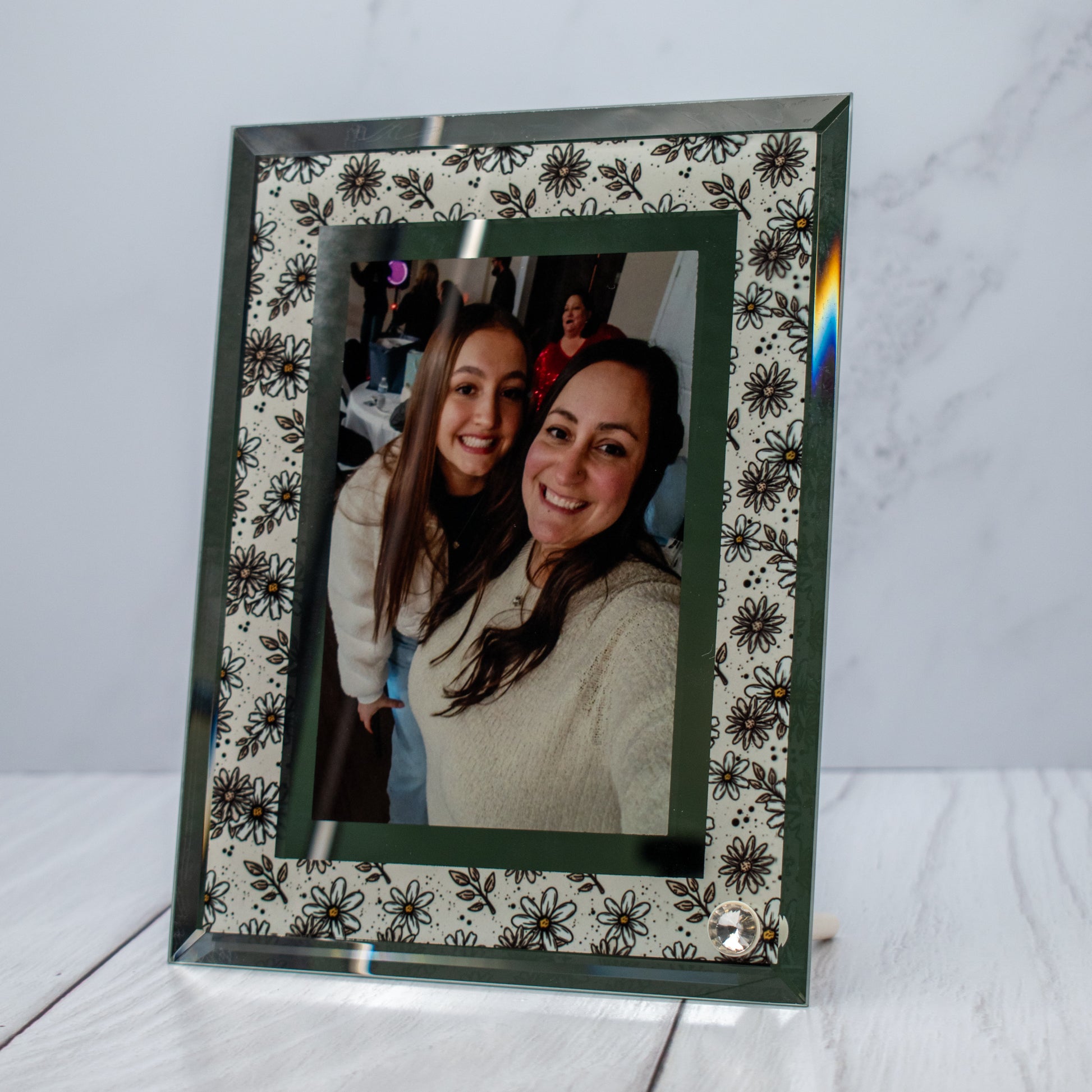 Customize these beautiful glass frames to create elegant gifts for weddings, anniversaries and more. The solid white sublimation surface on the back of the frame allows the colors of any image to shine, while the mirrored finish reflects light and creates an eye-catching display.